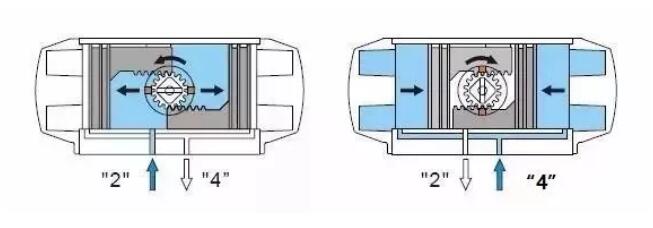 當(dāng)氣源壓力從氣口(2)進(jìn)入氣缸兩活塞之間中腔時,使兩活塞分離向氣缸兩端方向移動,兩端氣腔的空氣通過氣口(4)排出,同時使兩活塞齒條同步帶動輸出軸 (齒輪)逆時針方向旋轉(zhuǎn)。反之氣源壓力從氣口(4)進(jìn)入氣缸兩端氣腔時,使兩活塞向氣缸中間方向移動,中間氣腔的空氣通過氣口(2)排出,同時使兩活塞齒條同步帶動輸出軸(齒輪)順時針方向旋轉(zhuǎn)。(如果把活塞相對反方向安裝,輸出軸即變?yōu)榉聪蛐D(zhuǎn))