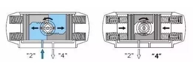 當(dāng)氣源壓力從氣口(2)進(jìn)入氣缸兩活塞之間中腔時,使兩活塞分離向氣缸兩端方向移動,迫使兩端的彈簧壓縮,兩端氣腔的空氣通過氣口(4)排出,同時使兩活塞齒條同步帶動輸出軸(齒輪)逆時針方向旋轉(zhuǎn)。在氣源壓力經(jīng)過電磁閥換向后,氣缸的兩活塞在彈簧的彈力下向中間方向移動,中間氣腔的空氣從氣口(2)排出,同時使兩活塞齒條同步帶動輸出軸(齒輪)順時針方向旋轉(zhuǎn)。(如果把活塞相對反方向安裝,彈簧復(fù)位時輸出軸即變?yōu)榉聪蛐D(zhuǎn))。